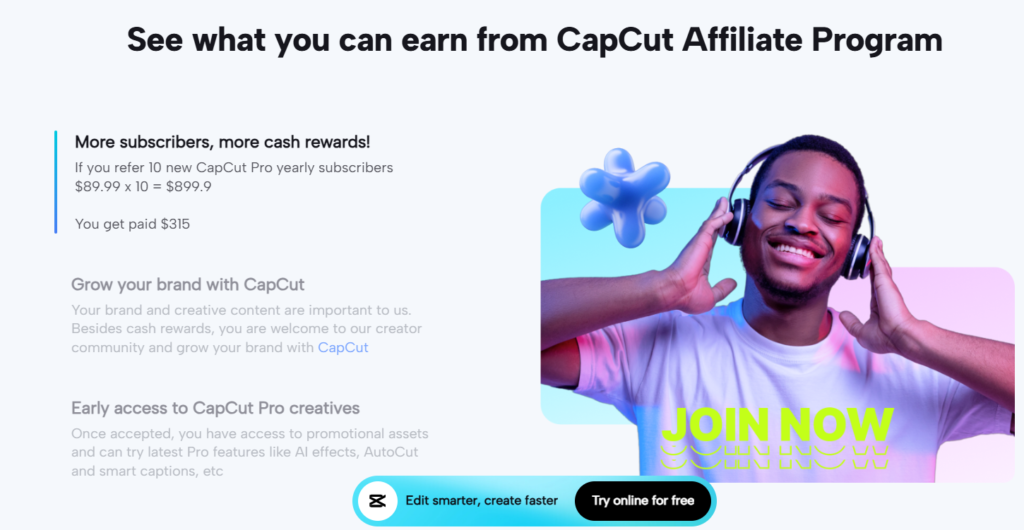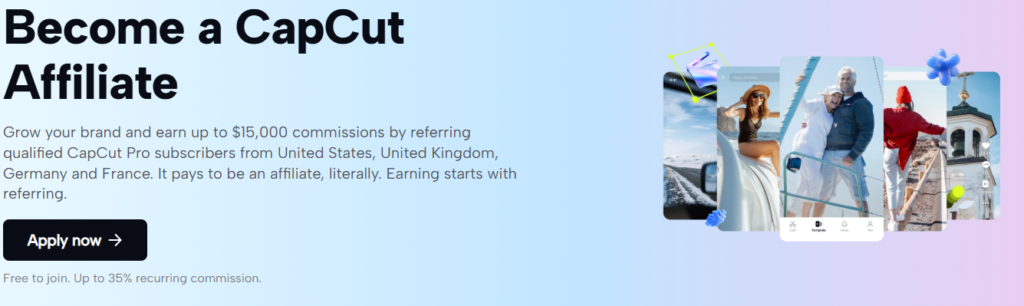 Grow your brand and earn up to $15,000 commissions by referring qualified CapCut Pro subscribers from United States, United Kingdom, Germany and France. It pays to be an affiliate, literally. Earning starts with referring. Free to join. Up to 35% recurring commission.
