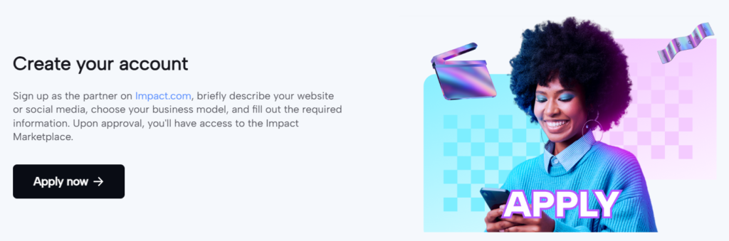 Sign up as the partner on Impact.com, briefly describe your website or social media, choose your business model, and fill out the required information. Upon approval, you’ll have access to the Impact Marketplace.
