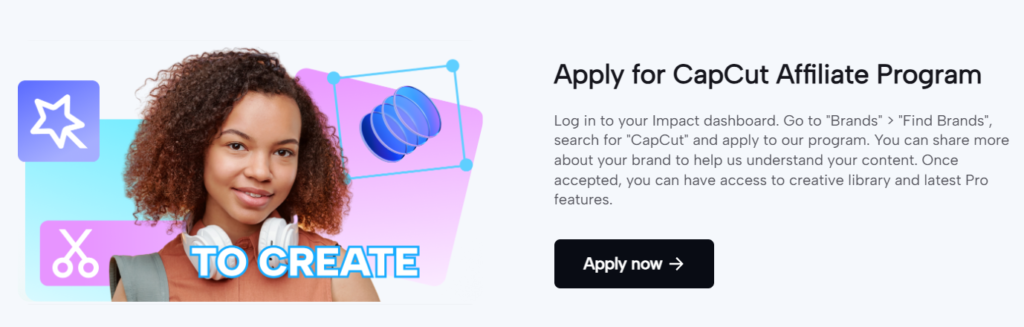 Log in to your Impact dashboard. Go to “Brands” > “Find Brands”, search for “CapCut” and apply to our program. You can share more about your brand to help us understand your content. Once accepted, you can have access to creative library and latest Pro features.